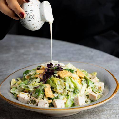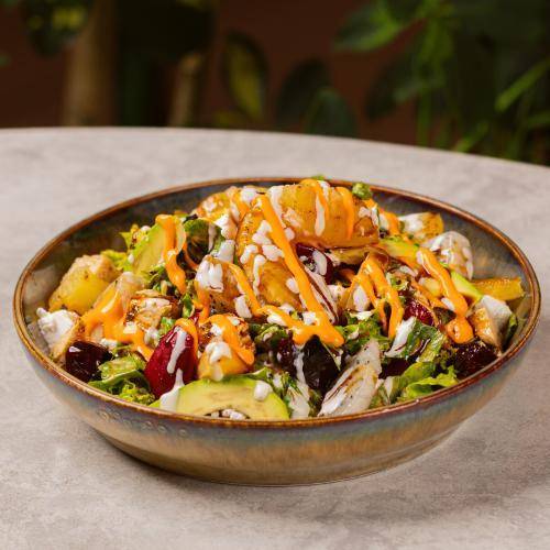 مزيج من الخس الامريكي والروماني مع قطع الدجاج المشوي المتبل مع الفيتا تشيز والدراجون والبرقوق والافوكادو والاناناس مع الصوص الخاص