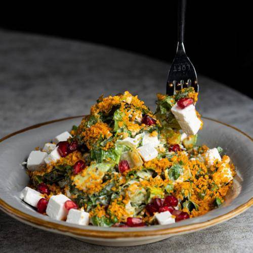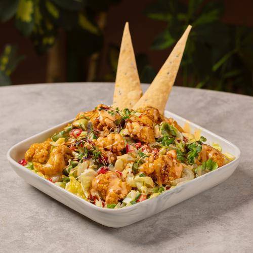 مزيج من الخس الامريكي والروماني مع قطع الدجاج الكرسبي مع الفلفل الالوان والبصل والخيار والرمان وشرائح الافاش المحمصة والصوص الخاص