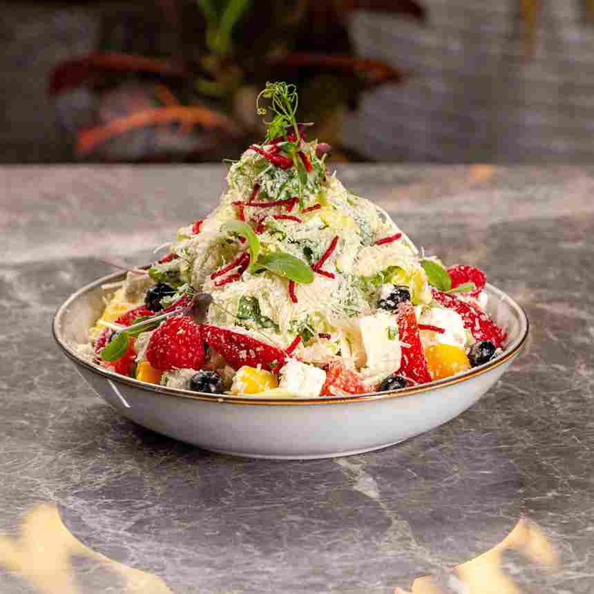 خس امريكي -جرجير -مانجو-جريب فروت-فراولة -توت -مزيج من جبن البارميزان والفيتا -شرائح الشمندرالمقلي -سيزون صوص